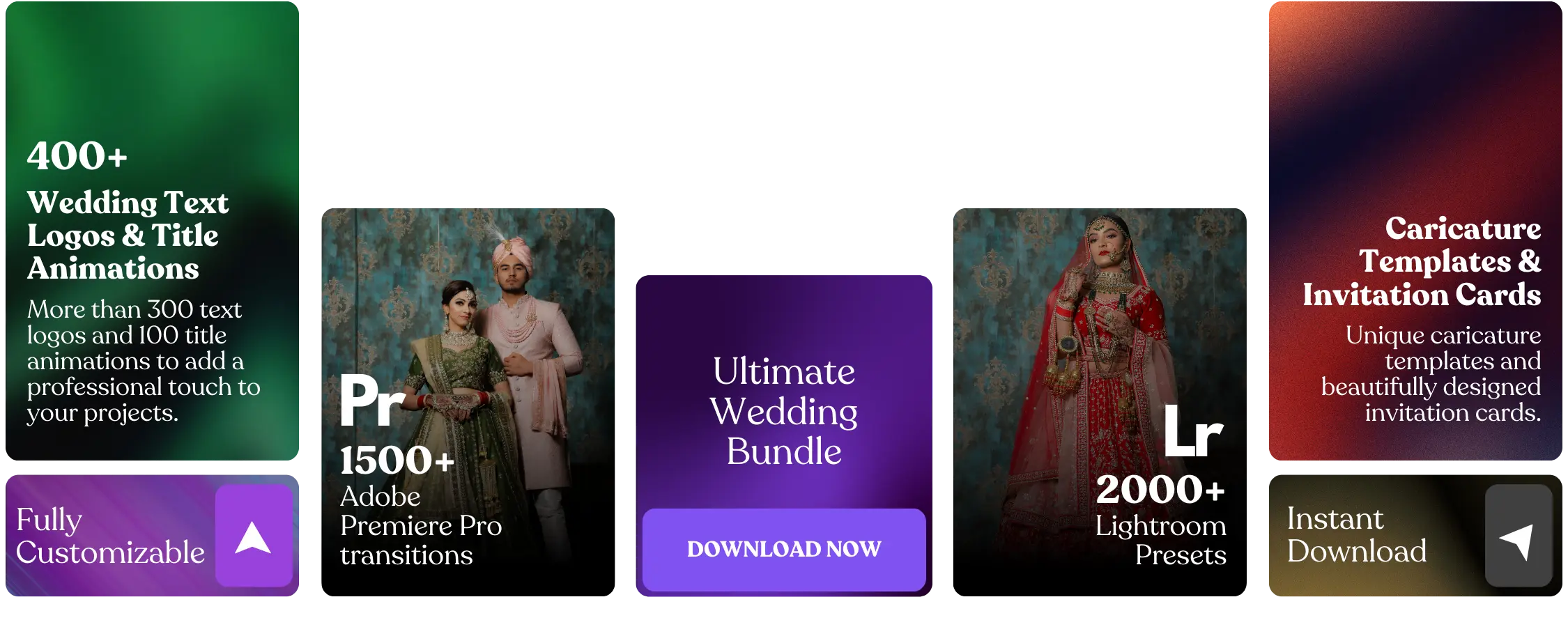 Over 50 packages including 2000+ Lightroom presets, 1500+ Premiere Pro transitions, 300+ wedding text logos, and more, providing all the tools you need in one bundle.